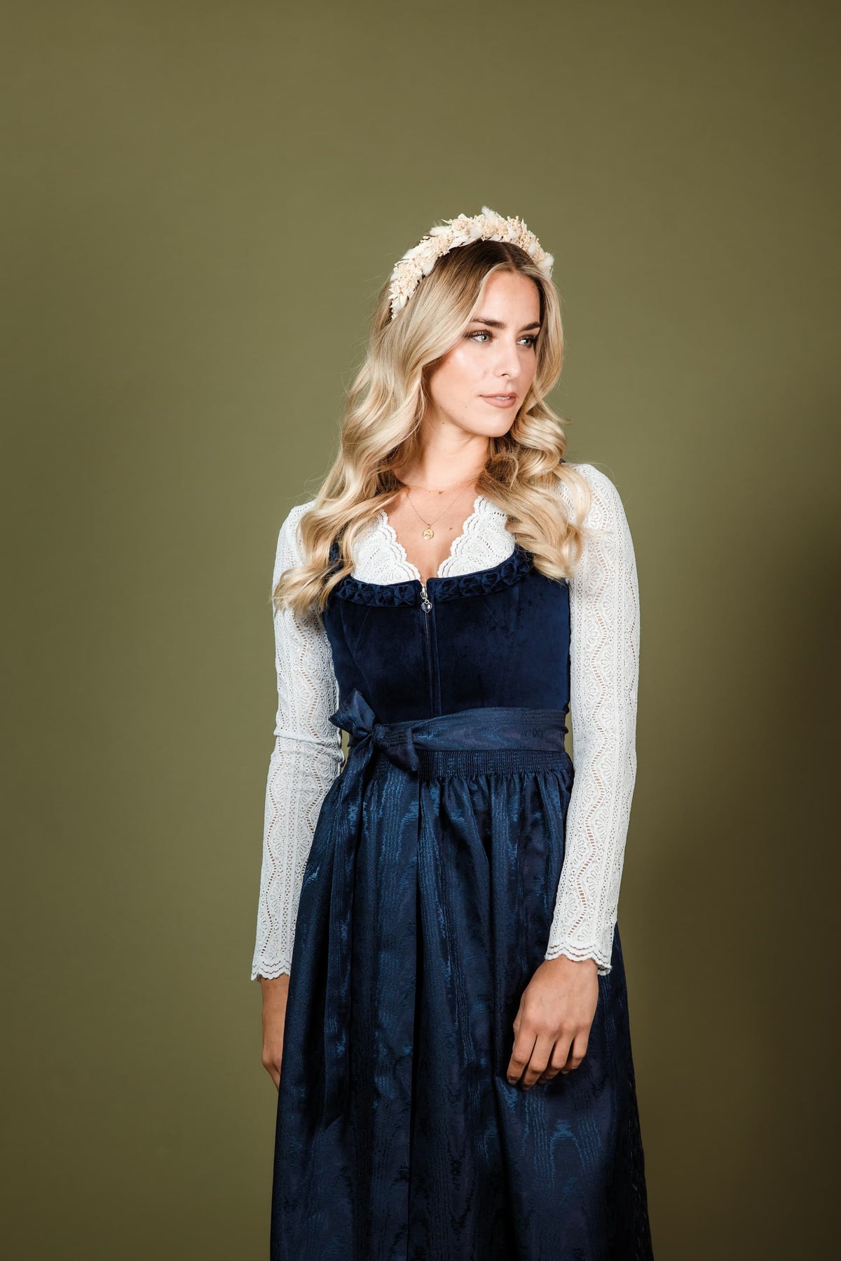 Die Dirndlbluse Lana von Alpenfee verzaubert mit zarter Dresdner Spitze und einem liebevoll gestalteten, verspielten Ausschnitt, der das Dekolleté charmant in Szene setzt. Die langen Ärmel aus feinem Spitzenmaterial verleihen der Bluse eine besonders edle Ausstrahlung – perfekt für stilvolle Auftritte in Kombination mit deinem Lieblingsdirndl.