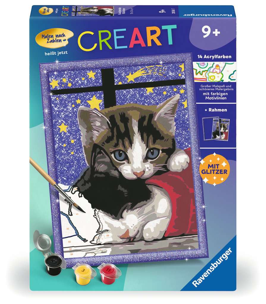 Farbige Motivlinien: Größerer Malspaß & ein schöneres Ergebnis! Dank der farbigen Motivlinien, können die Kinder das ganze Motiv Kuschelnde Kätzchen und die Farben schneller erkennen. Der Pinsel hat eine gute Führung und so entsteht ein perfektes Bild. Die schönen Motive zum Ausmalen sind eine tolle Geschenkidee für Kinder ab 9 Jahren und eine schöne Dekoration. In diesem Malset sind bereits 14 fertig gemischte Acrylfarben enthalten. Verpackungsdesign kann abweichen. Mit Malen nach Zahlen von Ravensburger lernen die Kinder Flächen sorgfältig auszumalen, ihr Maltalent zu verbessern sowie feinmotorische Fähigkeiten zu entwickeln. Am Ende stehen Freude, Stolz und ein Erfolgserlebnis, das die Lust am Weitermalen weckt. Die Motive sind altersgerecht in drei Schwierigkeitsstufen umgesetzt: von einfachen Bildern mit wenigen, großen Malflächen bis hin zu Bildern mit vielen, kleinen Malflächen für Fortgeschrittene. Jedes Malset enthält alles, was Künstler zum Malen brauchen und es ist kein Mischen der Farben notwendig. Zusätzlich zur Maltafel, zu den Farben und zum Pinsel, ist in diesem Malset funkelnder Glitter enthalten. Sobald das Motiv fertig ausgemalt ist, wird der Glitter angemischt und aufgetragen. So entsteht wird das Motiv zum Glitzern gebracht. Das Ravensburger Malen nach Zahlen Programm bietet eine große Motivauswahl für Kinder und Erwachsene.